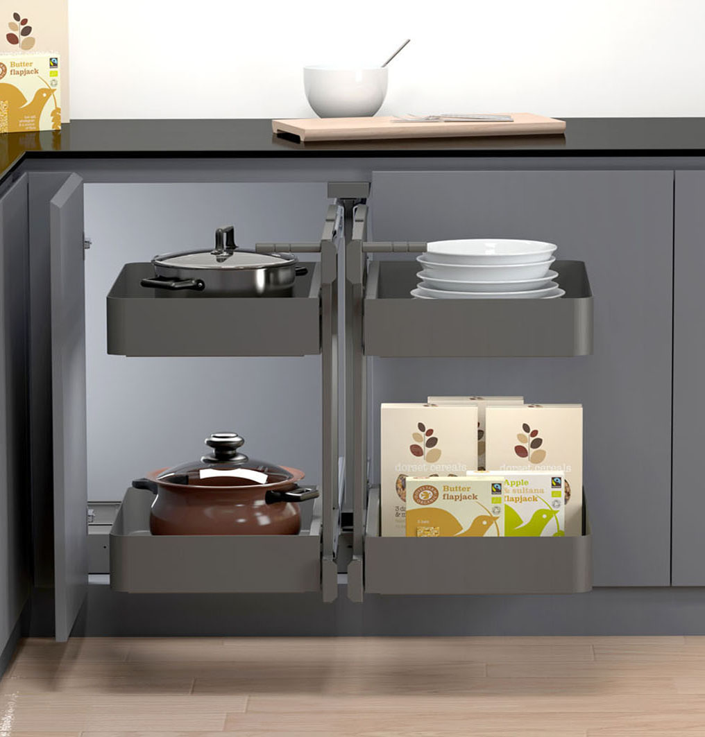 Μηχανισμός Magic Corner Plastimodul για πόρτες 40–45 cm, με ομαλή λειτουργία και αντοχή 8 κιλών ανά ράφι.